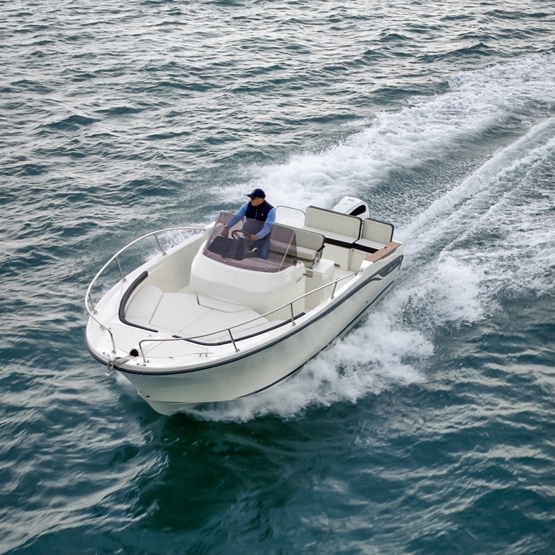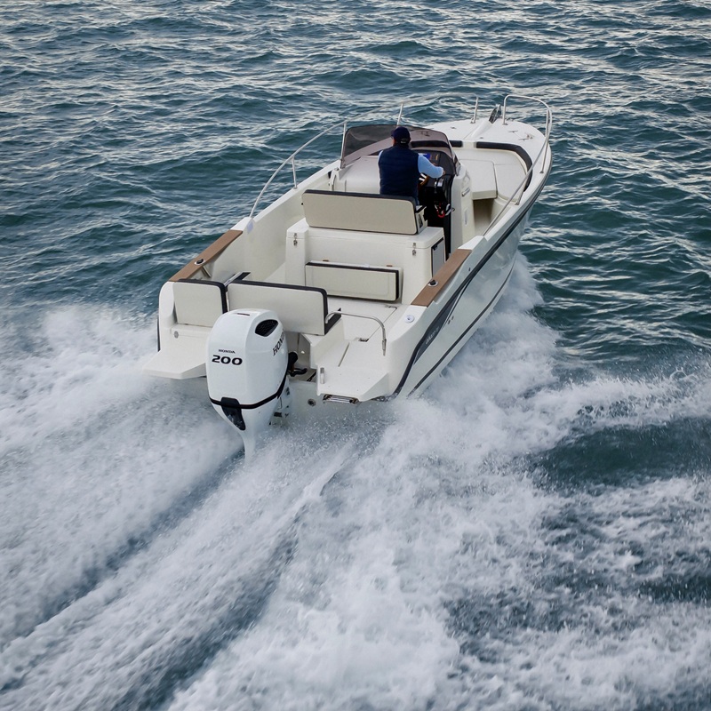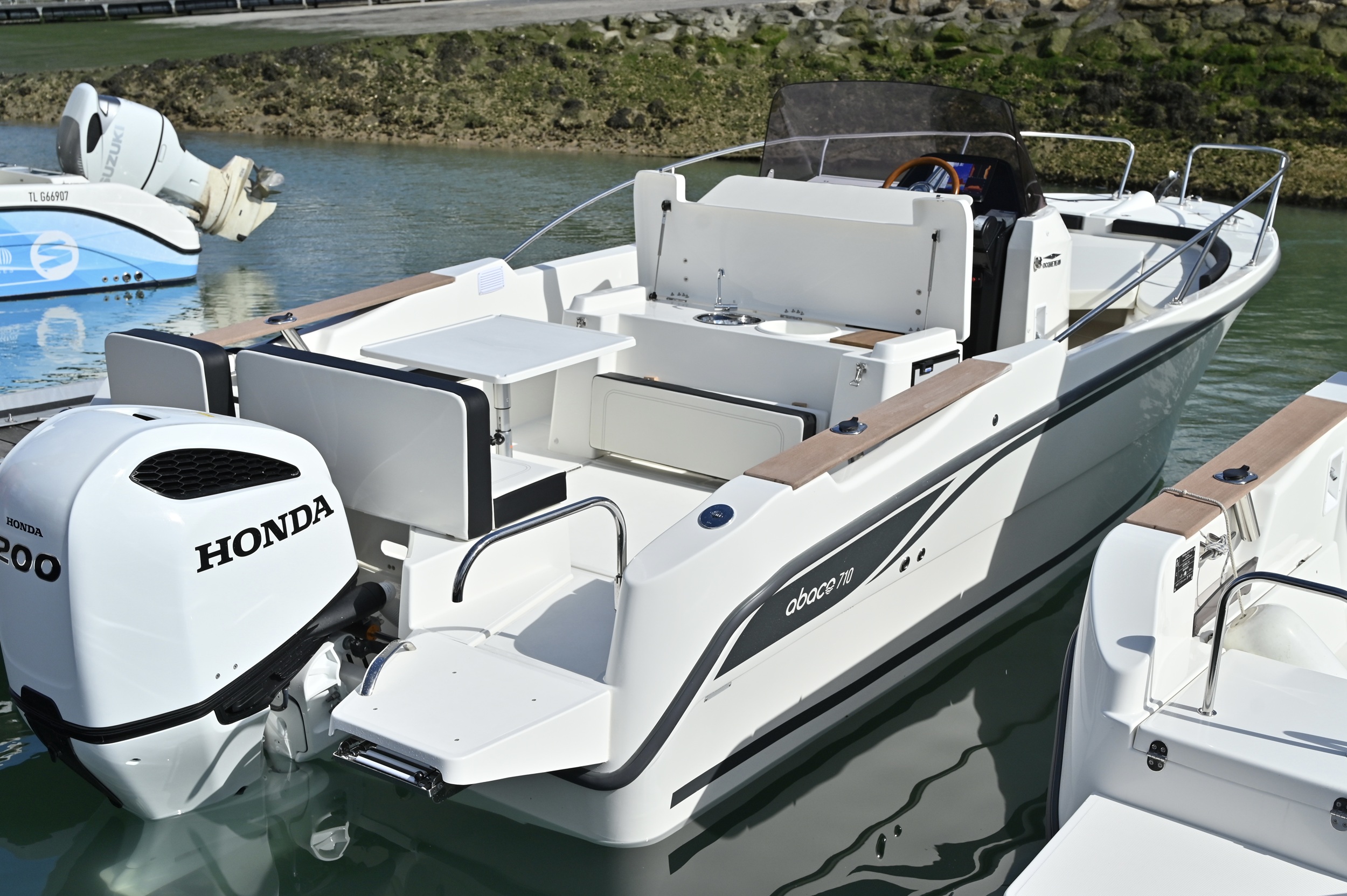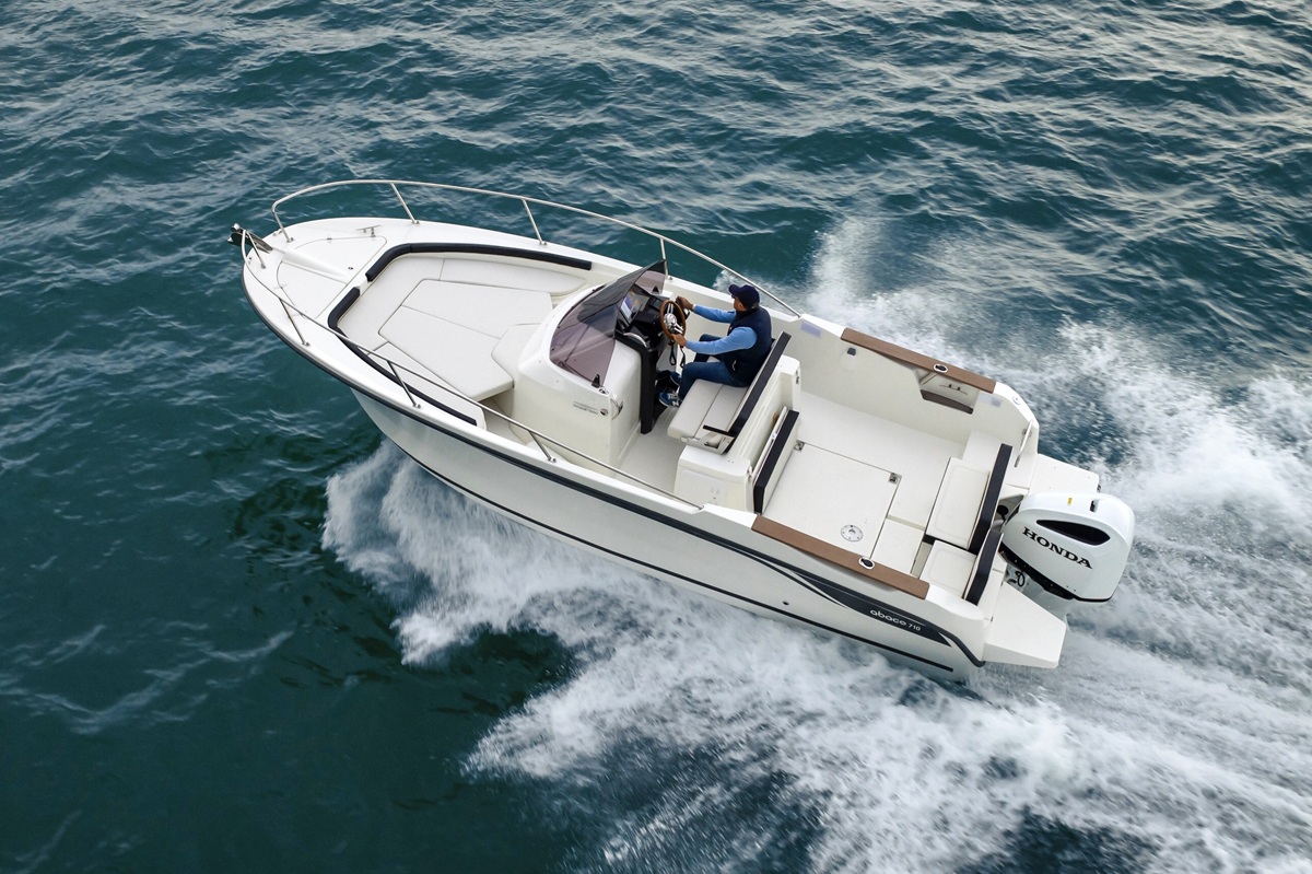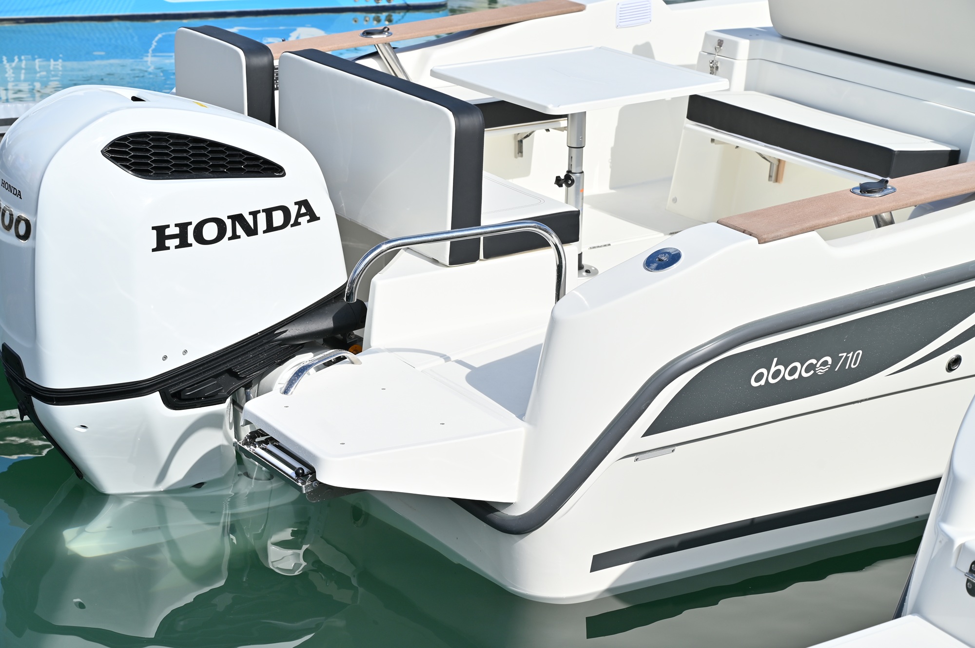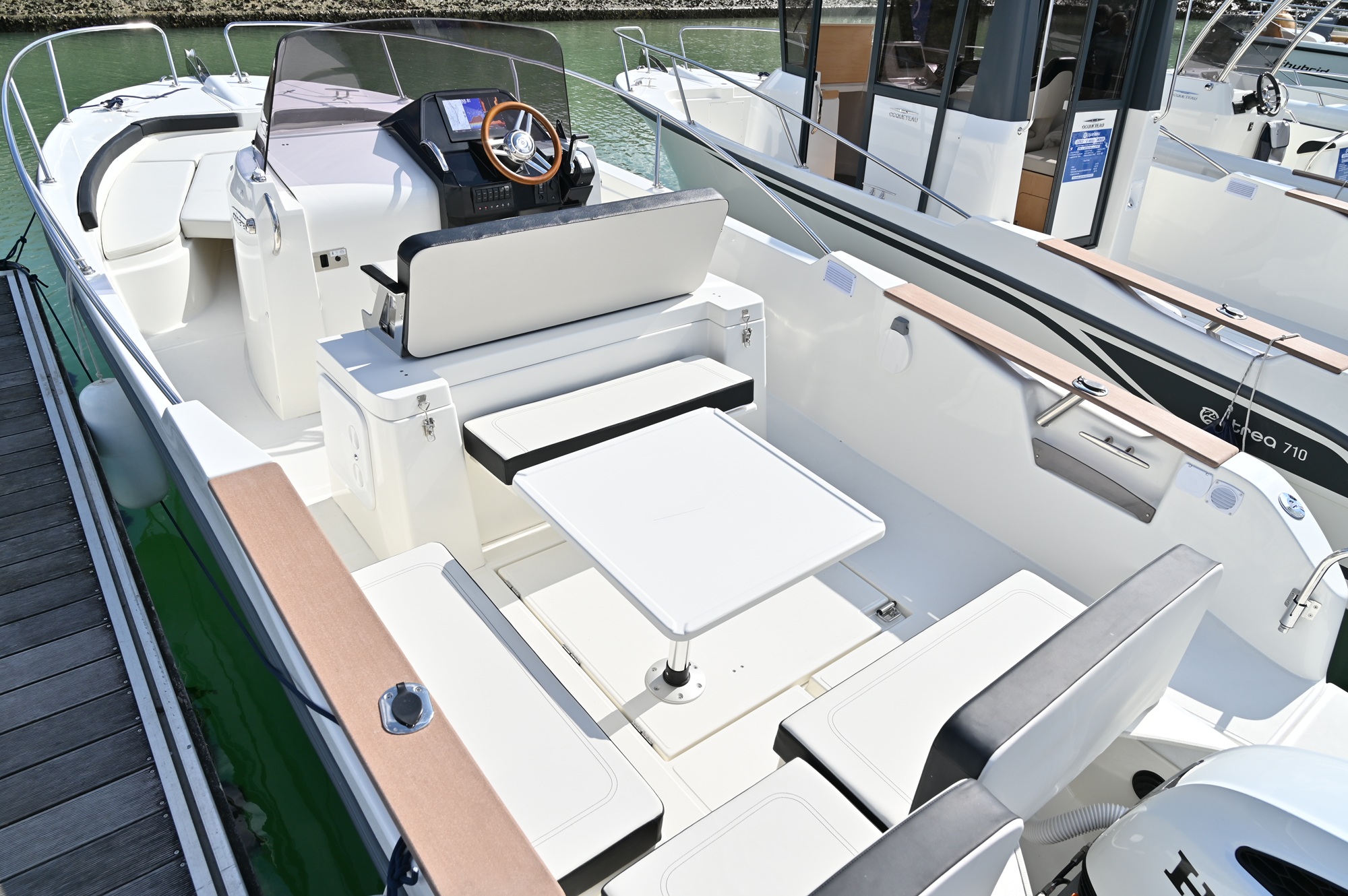 Concebido con la misma carena que el Ostrea 710 que seduce por sus cualidades marineras, con una cubierta muy diferente porque la timonera desaparece en beneficio de una consola central hacia atrás para facilitar el espacio para un gran solárium en proa.