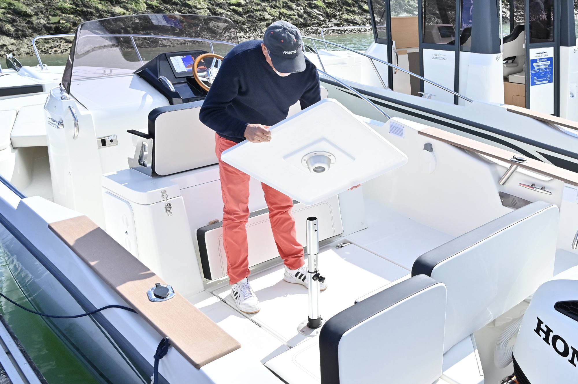 Con un banco compas vuelto hacia la bañera, los dos bancos laterales y el banco popa, 8 personas pueden instalarse alrededor de la doble mesa de bañera.