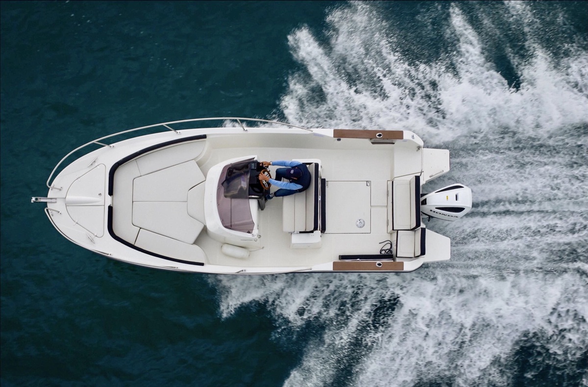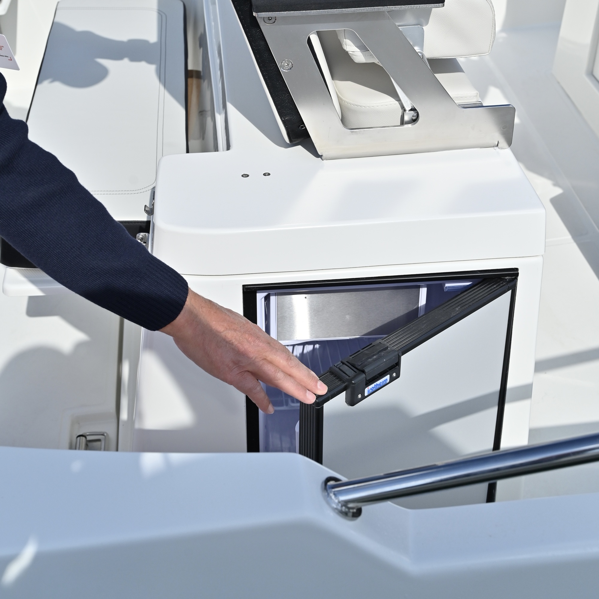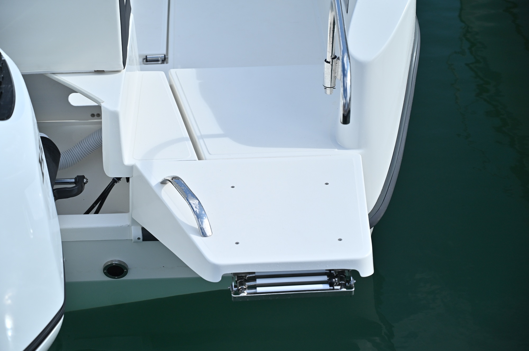Esa cubierta espaciosa y ergonómica comprende unos pasillos anchos, un capó popa abatible, unos bancos plegables(1), unos cofres asiento. Bajo la cubierta y la consola, el espacio puede ser equipado con una cama doble (1) y un sanitario(1) para el placer de una noche a bordo.